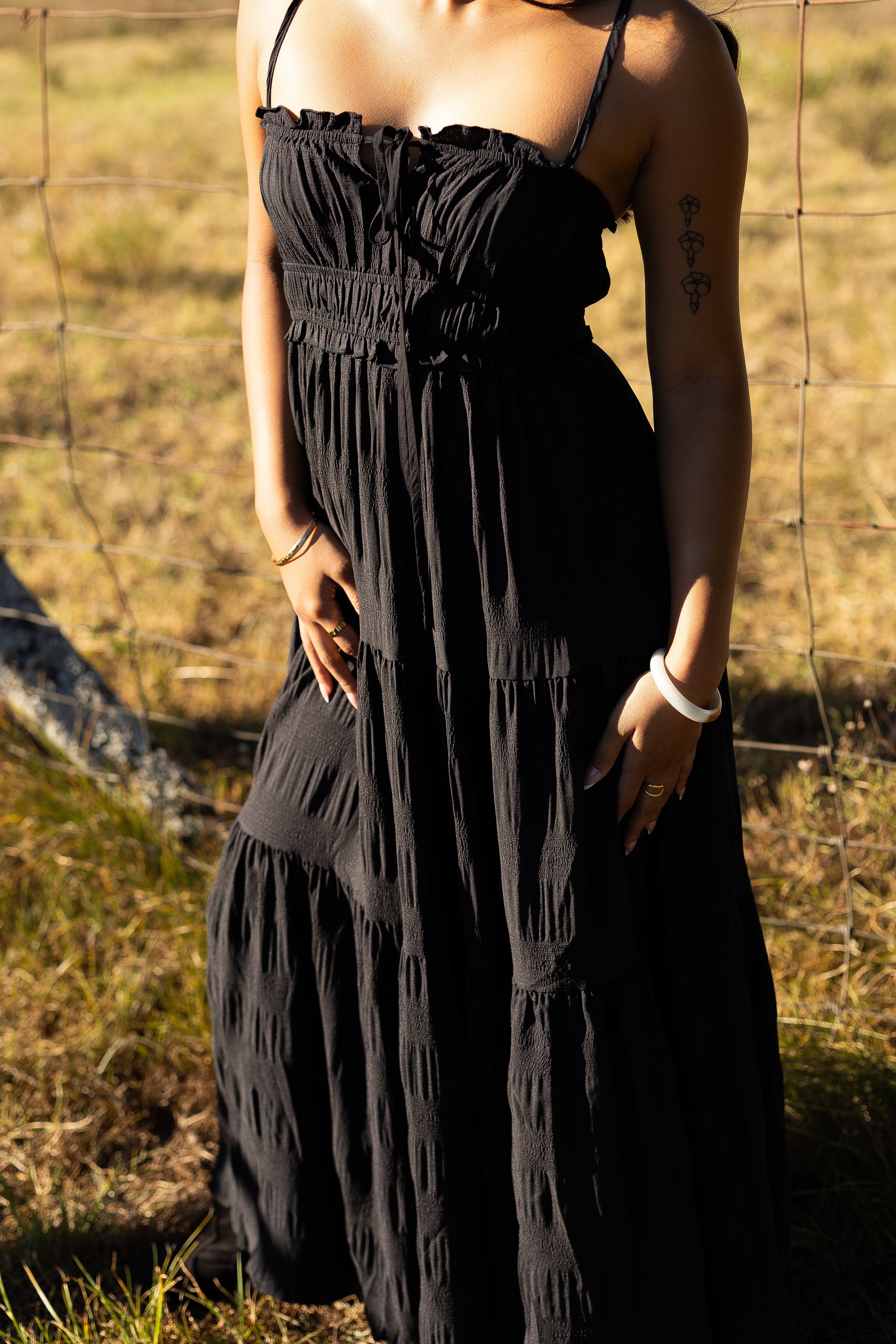 The Alexa Maxi Dress is all about playful charm with its tiered design and ruched bodice. The square neckline and sweet tie front add a flirty touch, while the smocked elastic band under the bust ensures a comfy, flattering fit.