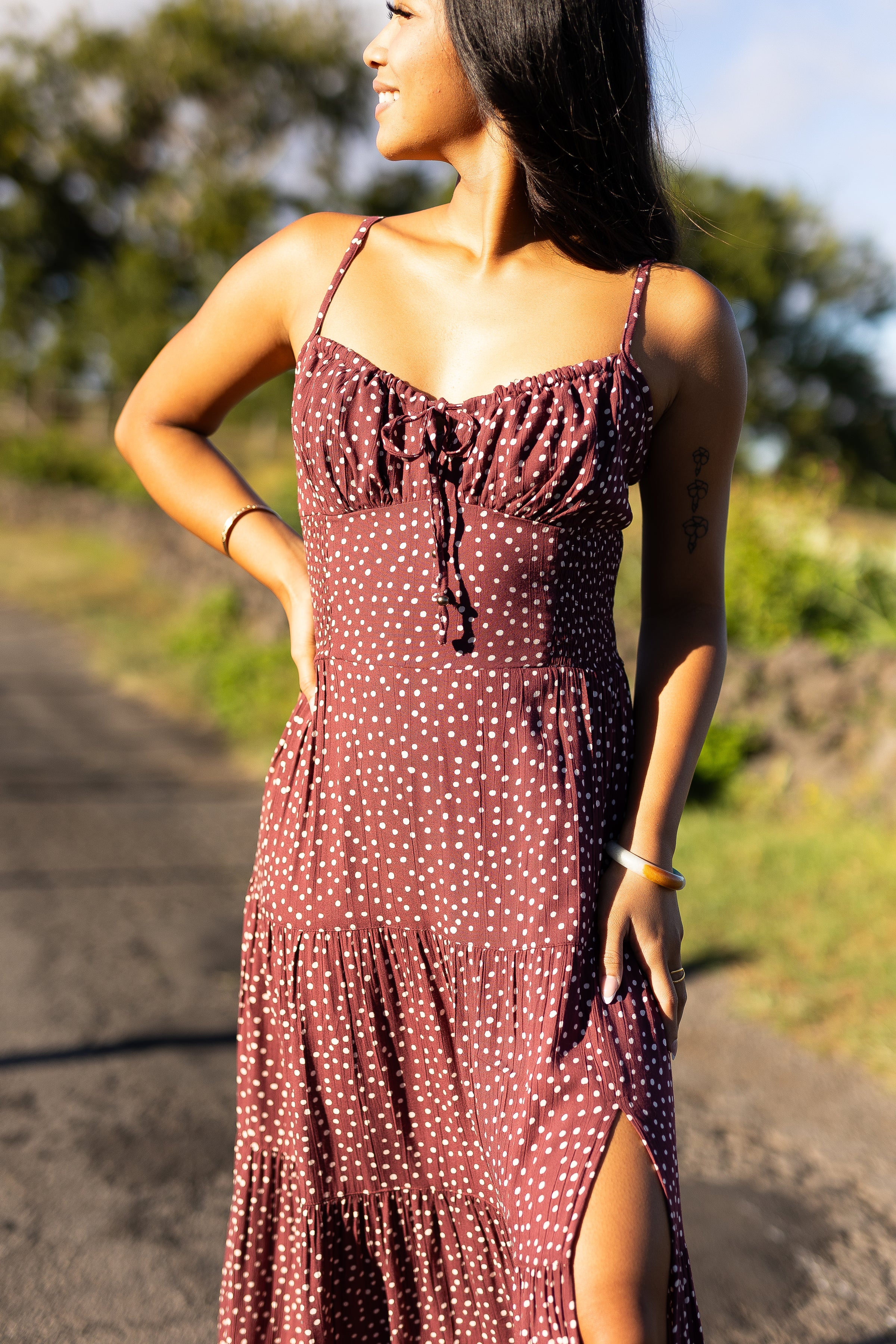 The Chelsea Dress is a playful maxi that turns heads with its polka dot print and sweetheart neckline. A keyhole front with self-tie beaded straps adds a touch of charm, while smocking at the back and sides ensures a comfy fit. The tiered ruffle hem and front slit bring flirty movement, making this dress perfect for sunny adventures or special occasions.