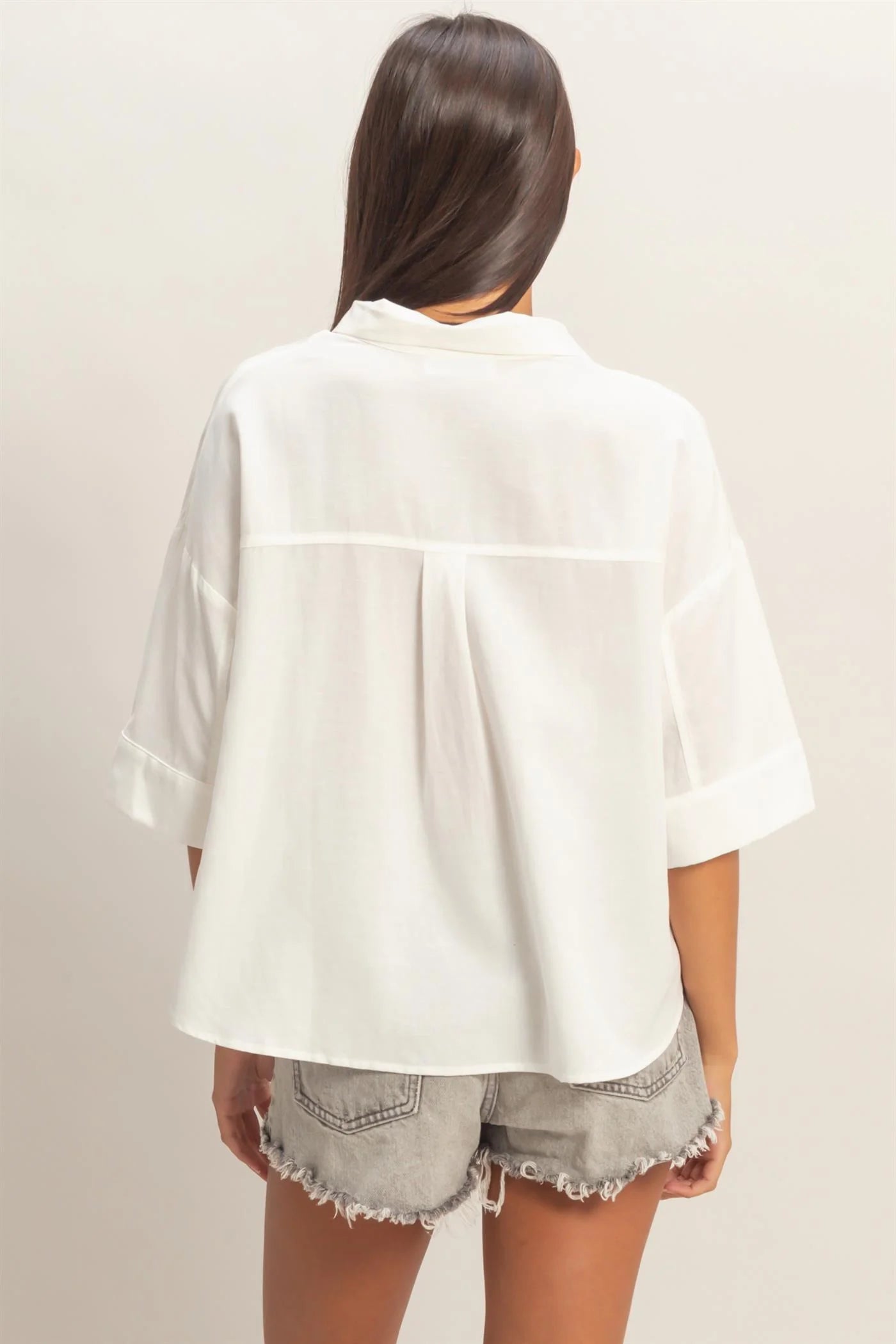 Effortless style meets everyday comfort in the Soleil Top. This button-up shirt features a classic collared neckline, relaxed short sleeves with cuffed details, and a gently tunic-inspired silhouette that moves with you. Button front closure adds a practical charm.