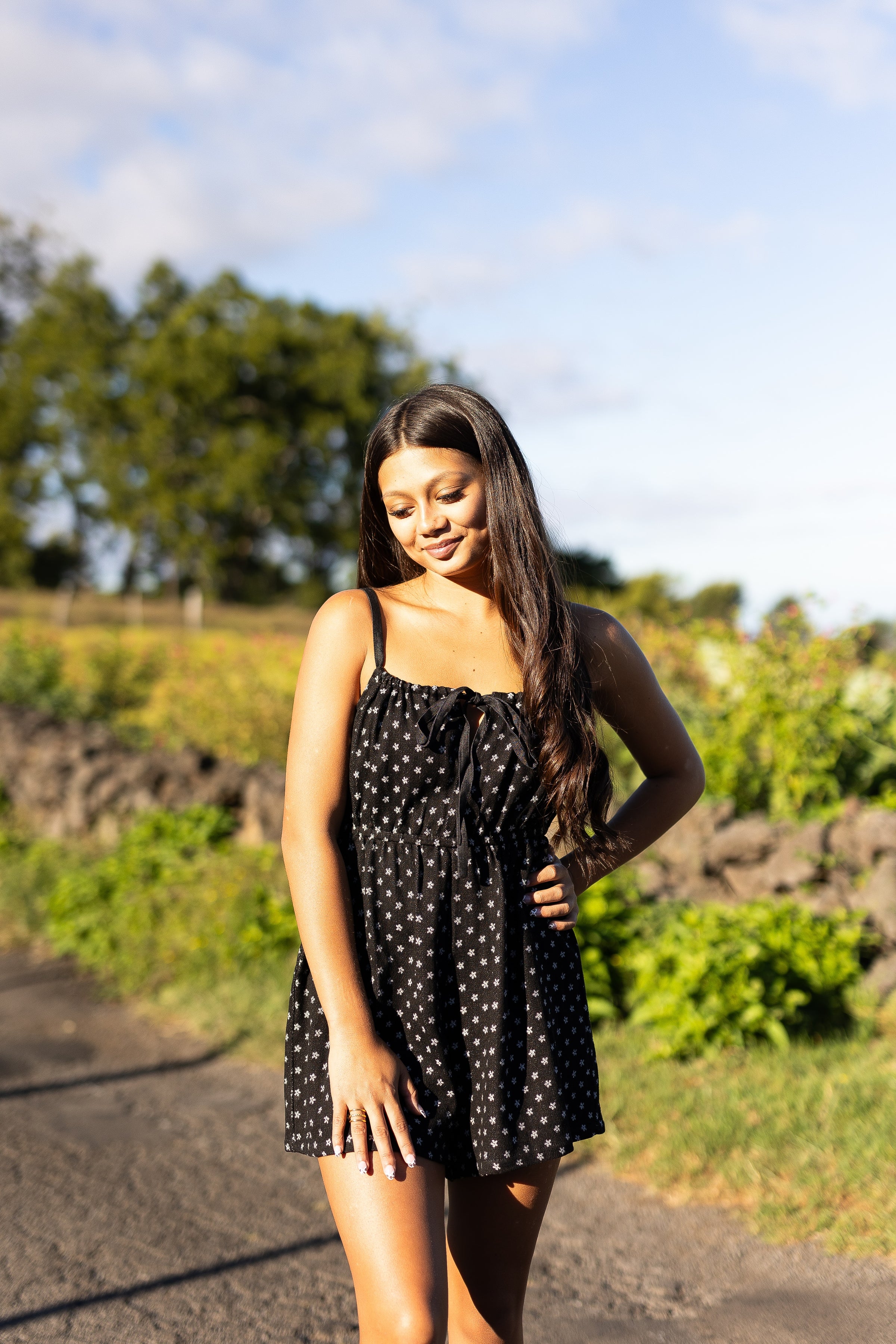 Say hello to sunshine-ready style with the Sadie Floral Romper. Made from lightweight, soft-washed denim with an allover dainty white floral print, this romper is equal parts easygoing and charming. Adjustable tie-front detail creates a peekaboo keyhole neckline for a flirty touch. Elasticized waistband helps defines the silhouette.